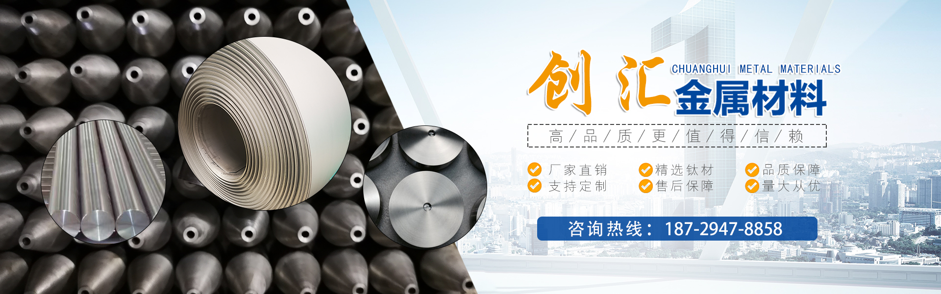 寶雞市創(chuàng)匯金屬材料有限公司,位于有“中國(guó)鈦谷”之稱寶雞寶鈦路南段,這里也是國(guó)家重點(diǎn)支持和扶持的有色金屬材料資源產(chǎn)業(yè)基地,我司專業(yè)從事鈦、鋯、鉿、鎳鉻、鎢鉬、鉭鈮、合金材料、復(fù)合材料,板、棒、絲、管、箔材等,設(shè)備制造,金屬制品機(jī)械加工銷售。